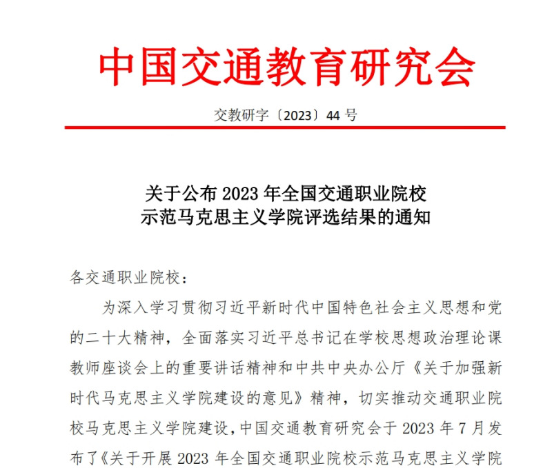 近日,我院馬克思主義學(xué)院被評(píng)為2023年全國(guó)交通職業(yè)院校示范馬克思主義學(xué)院。