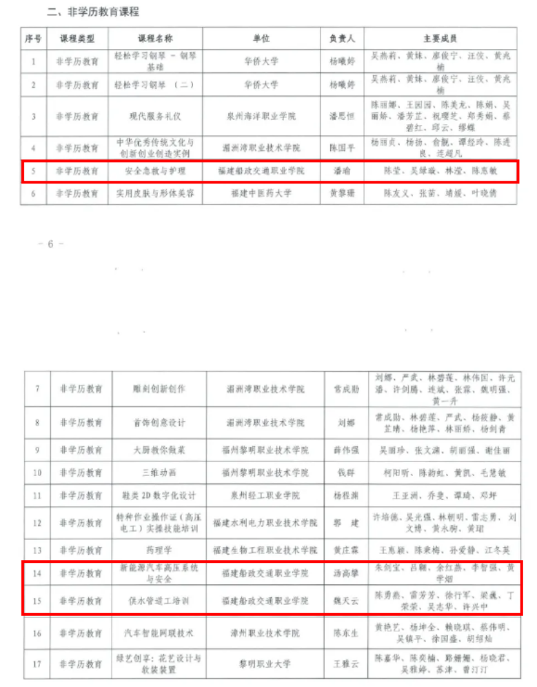 近日,福建省終身教育促進委員會公布《2024年省級繼續(xù)教育數(shù)字化精品課程》,共認定139門課程為2024年省級繼續(xù)教育數(shù)字化精品課程,其中,學(xué)歷繼續(xù)教育課程37門、非學(xué)歷教育課程41門、職業(yè)技能培訓(xùn)課程22門、社區(qū)(老年)教育課程39門。我院非學(xué)歷教育課程《安全急救與護理》《新能源汽車高壓系統(tǒng)與安全》《供水管道工培訓(xùn)》、社區(qū)(老年)教育課程《晚年出行新模式》共四門課程成功入選。