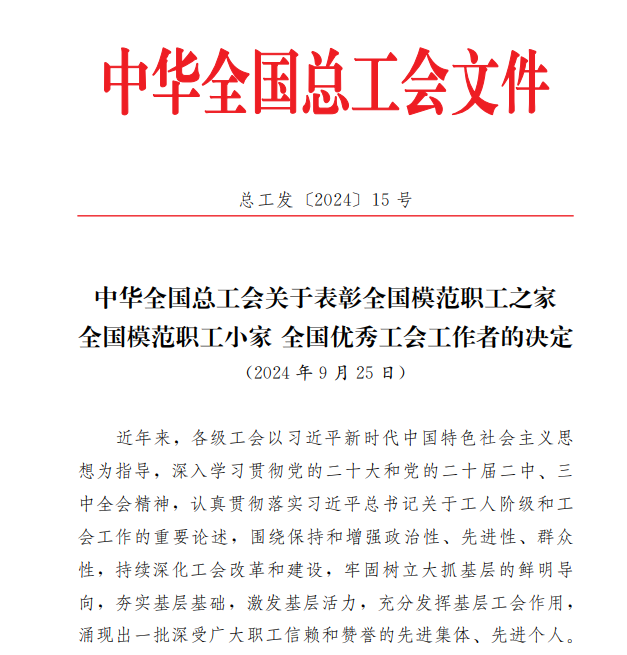 近日,中華全國總工會揭曉“全國模范職工之家、全國模范職工小家、全國優(yōu)秀工會工作者”評選結果,我院工會榮獲“全國模范職工之家”稱號?!叭珖7堵毠ぶ摇睒s譽稱號由中華全國總工會設立,是全國工會系統(tǒng)表彰先進集體的最高榮譽,是對基層工會工作的最高褒獎和肯定。