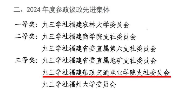 近日,九三學(xué)社福建省委員會直屬工作委員會表彰2024年度各項(xiàng)社務(wù)工作先進(jìn)集體和先進(jìn)個人,九三學(xué)社福建船政交通職業(yè)學(xué)院支社委員會榮獲2024年度參政議政先進(jìn)集體三等獎,支社主委鄒澤昌、副主委陳樂天榮獲2024年度優(yōu)秀社員。
