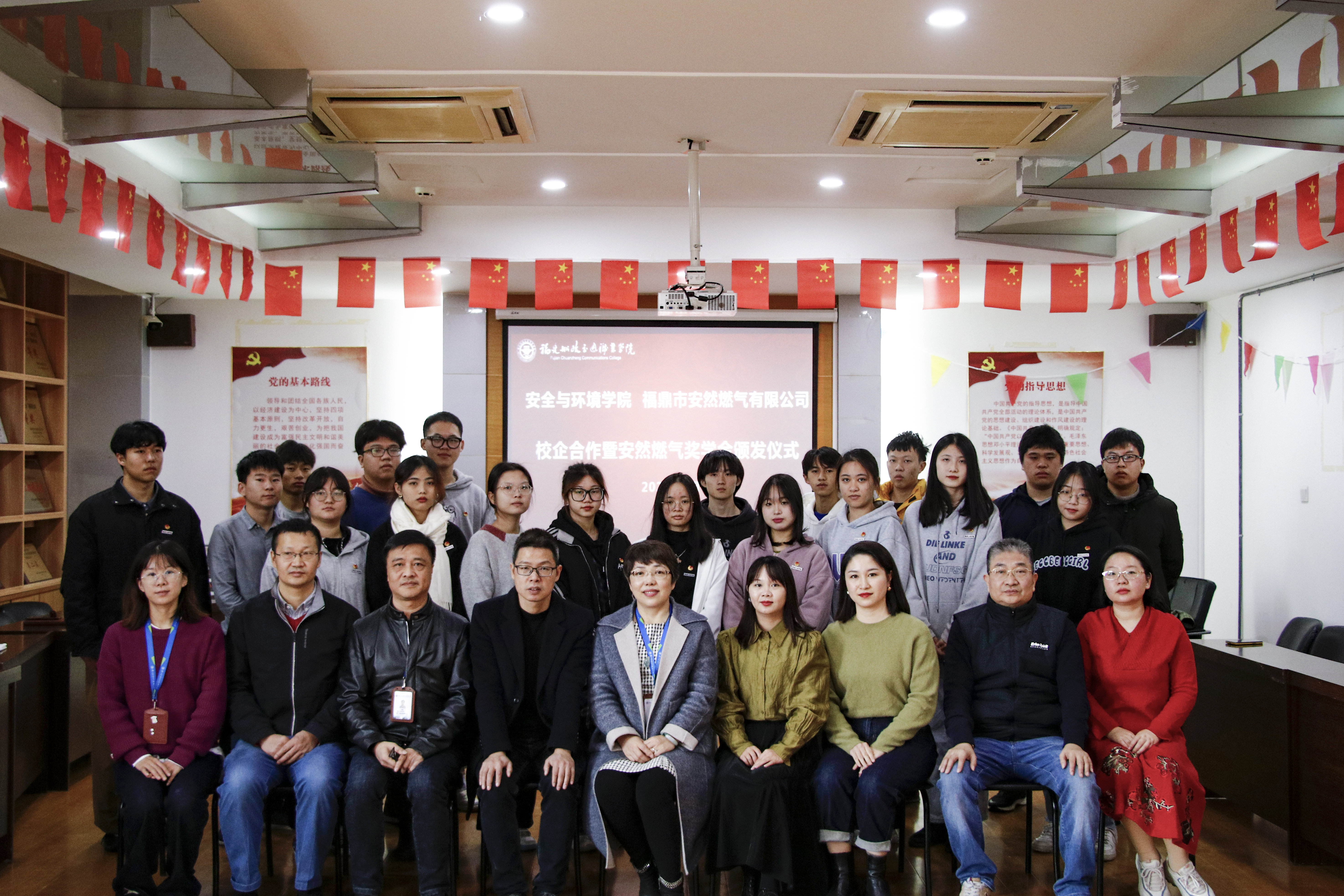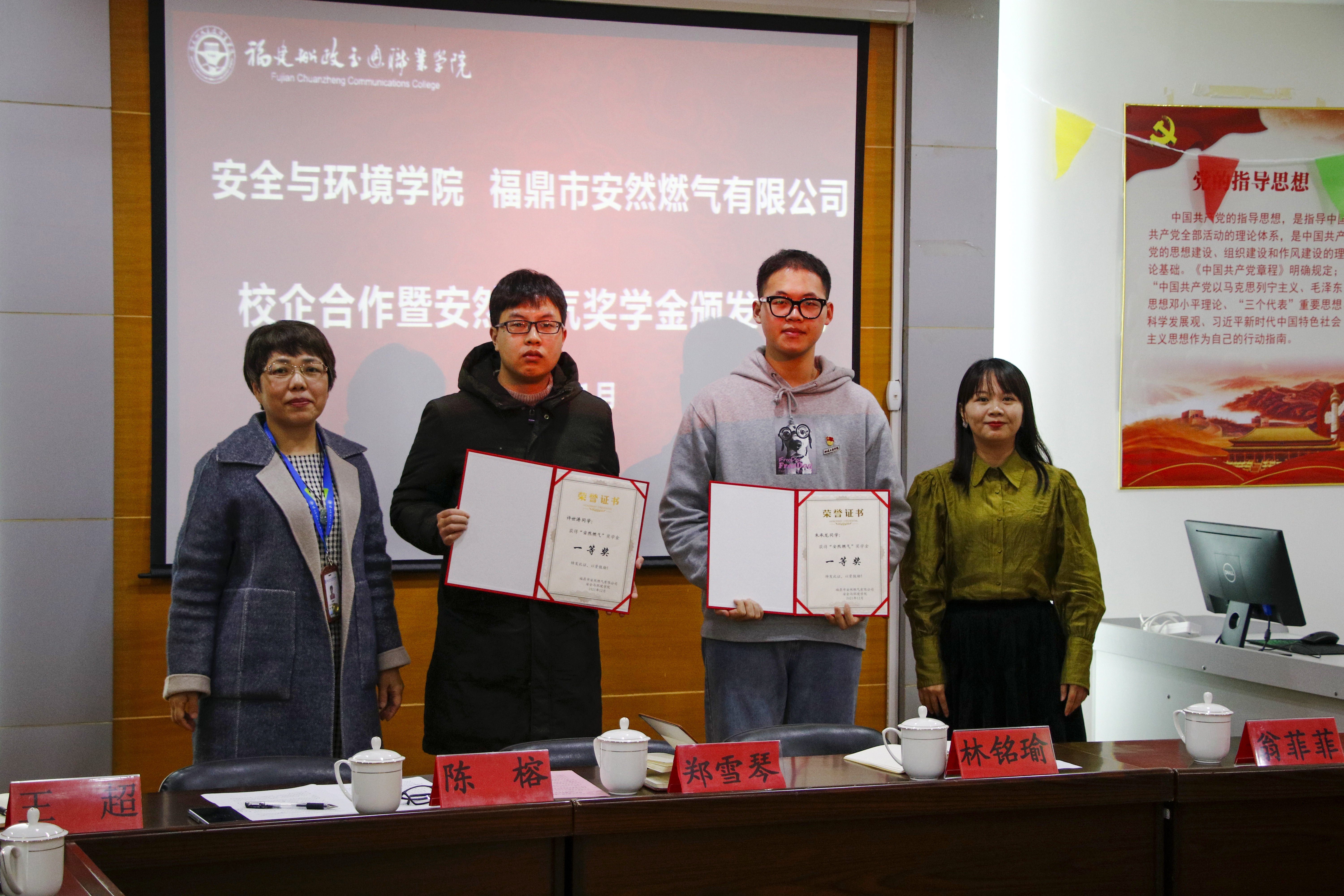 2022年1月5日上午,福鼎市安然燃?xì)庥邢薰敬砀拔以号e行安全與環(huán)境學(xué)院與福鼎市安然燃?xì)庥邢薰景踩蝗細(xì)猹?jiǎng)學(xué)金頒發(fā)儀式。