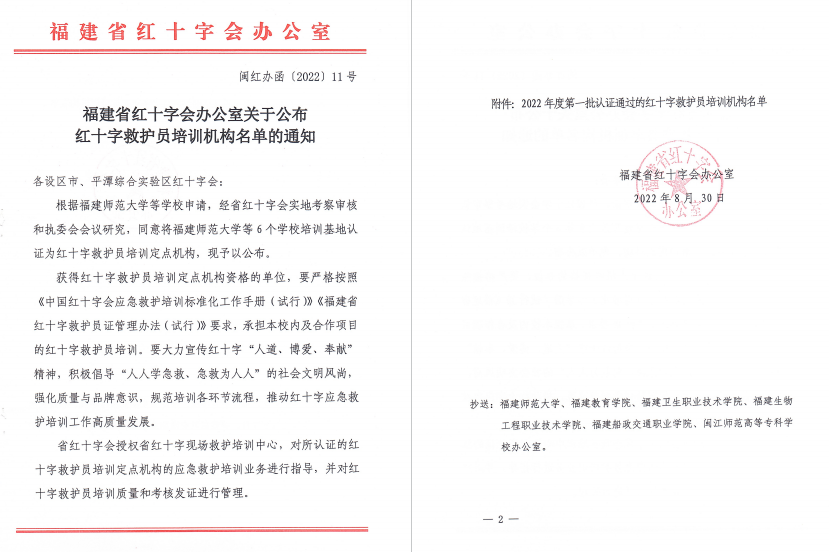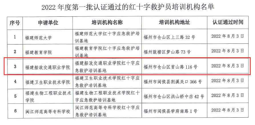 2022年7月底-8月初,在校領(lǐng)導(dǎo)的關(guān)心支持下,安全與環(huán)境學(xué)院積極準(zhǔn)備,完成“紅十字應(yīng)急救護(hù)培訓(xùn)基地”申報(bào)工作。經(jīng)福建省紅十字會實(shí)地考察審核,同意將福建船政交通職業(yè)學(xué)院認(rèn)證為紅十字救護(hù)員培訓(xùn)定點(diǎn)機(jī)構(gòu)。這標(biāo)志著福建船政交通學(xué)院正式成為2022年度第一批認(rèn)證通過的紅十字救護(hù)員培訓(xùn)機(jī)構(gòu)之一。