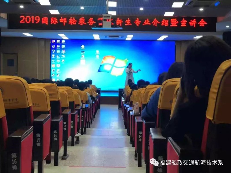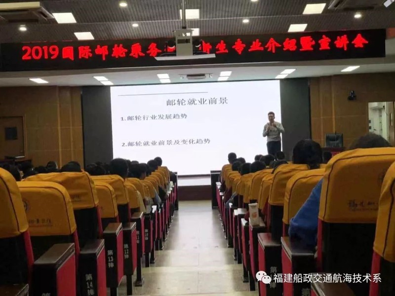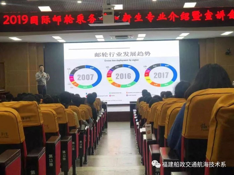 為使我系19級國際郵輪乘務(wù)新生能夠更快適應(yīng)大學(xué)生活,了解自己所學(xué)專業(yè),明確學(xué)習(xí)目標(biāo),增強學(xué)習(xí)動力。航海技術(shù)系于2019年9月9日19點在一號樓學(xué)術(shù)報告廳開展了“2019級國際郵輪乘務(wù)管理新生專業(yè)介紹暨宣講講座”。并邀請廈門海陸海事服務(wù)有限公司郵輪面試官李樂天先生、航海技術(shù)系副主任翁國玲老師和黃超夷老師參加本次宣講。