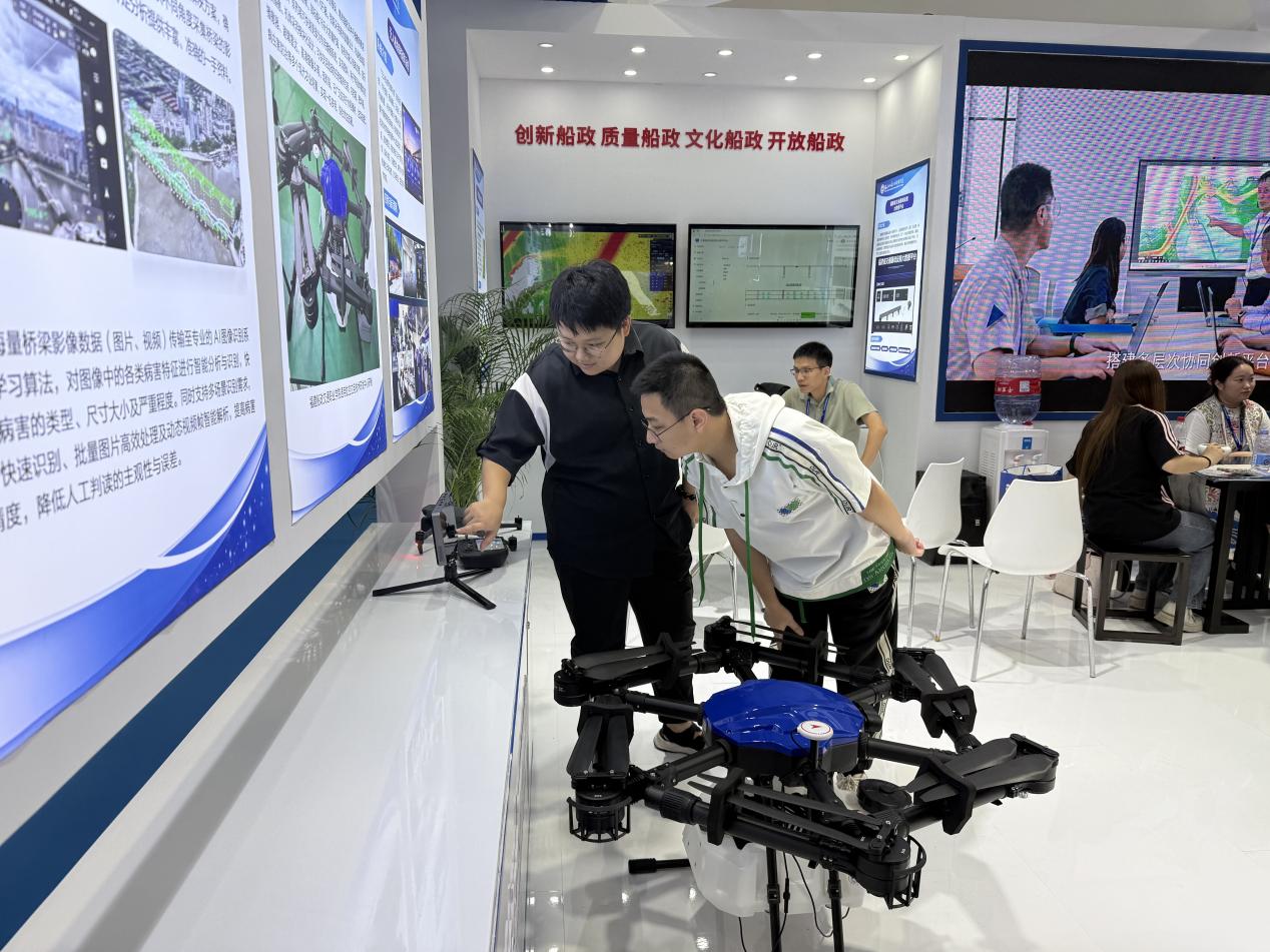 我院受邀參展并在主賓館設(shè)立展區(qū),重點展示了一系列兼具技術(shù)實力與應(yīng)用價值的成果:包括傳承船政文化的趕繒船結(jié)構(gòu)復(fù)原模型,聚焦智能裝備領(lǐng)域的 AIS 交通流分析系統(tǒng)、Ener16p 農(nóng)業(yè)植保無人機、無人機協(xié)同指揮系統(tǒng)、橋梁無人機巡檢及 AI 病害識別系統(tǒng),深耕大數(shù)據(jù)應(yīng)用的福建省交通基礎(chǔ)設(shè)施大數(shù)據(jù)平臺,以及榮獲國家級教學成果獎的《新船政學堂:燈塔型航海人才雙適任育訓(xùn)范式創(chuàng)新實踐》項目。豐富多元的展品吸引了眾多參會觀眾駐足咨詢、互動體驗并拍照記錄。展區(qū)內(nèi)的茶藝展示區(qū)更是成為交流熱點,專家學者們在品茗暢談間,圍繞航海類專業(yè)人才培養(yǎng)、船政文化傳承創(chuàng)新、區(qū)域海洋裝備產(chǎn)業(yè)升級、國際人才聯(lián)合培育等關(guān)鍵議題展開深度研討。展覽期間,我院的辦學成果與特色展品獲得多家官方媒體及自媒體的關(guān)注與宣傳報道,有效提升了學院的行業(yè)影響力與社會知名度。
