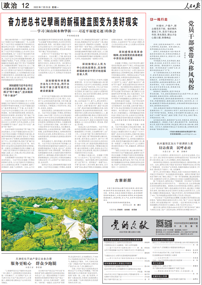 今天,人民日報刊發(fā)文章《奮力把總書記擘畫的新福建藍(lán)圖變?yōu)槊篮矛F(xiàn)實——學(xué)習(xí)<閩山閩水物華新——習(xí)近平福建足跡>的體會》,全文如下: