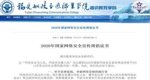 根據(jù)學(xué)校宣傳統(tǒng)戰(zhàn)部《關(guān)于開展國家網(wǎng)絡(luò)安全宣傳周活動的通知》要求,我院圍繞“網(wǎng)絡(luò)安全為人民,網(wǎng)絡(luò)安全靠人民”開展了2020年國家網(wǎng)絡(luò)安全宣傳周活動。