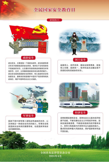 什么是全民國家安全教育日? 全民國家安全教育日(National Security Education Day),是為了增強全民國家安全意識,維護國家安全而設(shè)立的節(jié)日。2015年7月1日,全國人大常委會通過的《中華人民共和國國家安全法》第十四條規(guī)定,每年4月15日為全民國家安全教育日。 什么是國家安全? 根據(jù)《國家安全法》第二條規(guī)定: 國家安全是指國家政權(quán)、主權(quán)、統(tǒng)一和領(lǐng)土完整、人民福祉、經(jīng)濟社會可持續(xù)發(fā)展和國家其他重大利益相對處于沒有危險和不受內(nèi)外威脅的狀態(tài),以及保障持續(xù)安全狀態(tài)的能力。 什么是堅持總體國家安全觀 2014年4月15日,習(xí)近平總書記在中央國家安全委員會第一次全體會議上提出,堅持總體國家安全觀,走出一條中國特色國家安全道路。首次提出總體國家安全觀重大戰(zhàn)略思想。這是以習(xí)近平同志為核心的黨中央對國家安全理論的重大創(chuàng)新,是新形勢下維護和塑造中國特色國家安全的行動指南,具有重大的理論意義、時代意義、實踐意義。 總體國家安全觀的五大要素 1.以人民安全為宗旨 2.以政治安全為根本 3.以經(jīng)濟安全為基礎(chǔ) 4.以軍事、文化、社會安全為保障 5.以促進國際安全為依託 貫徹落實總體國家安全觀,做到十個重視(五對關(guān)系) 1.既重視外部安全、又重視內(nèi)部安全 2.既重視國土安全、又重視國民安全 3.既重視傳統(tǒng)安全、又重視非傳統(tǒng)安全 4.既重視發(fā)展問題、又重視安全問題 5.既重視自身安全、又重視共同安全