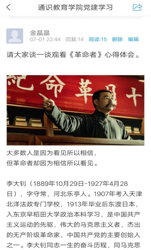 歷史川流不息,精神代代相傳。在觀影結(jié)束后各黨員通過(guò)“學(xué)習(xí)通”-“通識(shí)教育學(xué)院黨總支”-“討論”-“觀看黨建電影《革命者》,撰寫(xiě)心得體會(huì)”,通過(guò)觀看紅色電影《革命者》,師生黨員深刻感受到中國(guó)共產(chǎn)黨先驅(qū)們偉大的建黨精神,在奮斗中堅(jiān)持真理、堅(jiān)守理想,踐行初心、擔(dān)當(dāng)使命,不怕?tīng)奚?、英勇斗?zhēng),對(duì)黨忠誠(chéng)、不負(fù)人民,大家紛紛表示要繼續(xù)弘揚(yáng)光榮傳統(tǒng)、賡續(xù)紅色血脈,永遠(yuǎn)把偉大建黨精神繼承下去、發(fā)揚(yáng)光大。