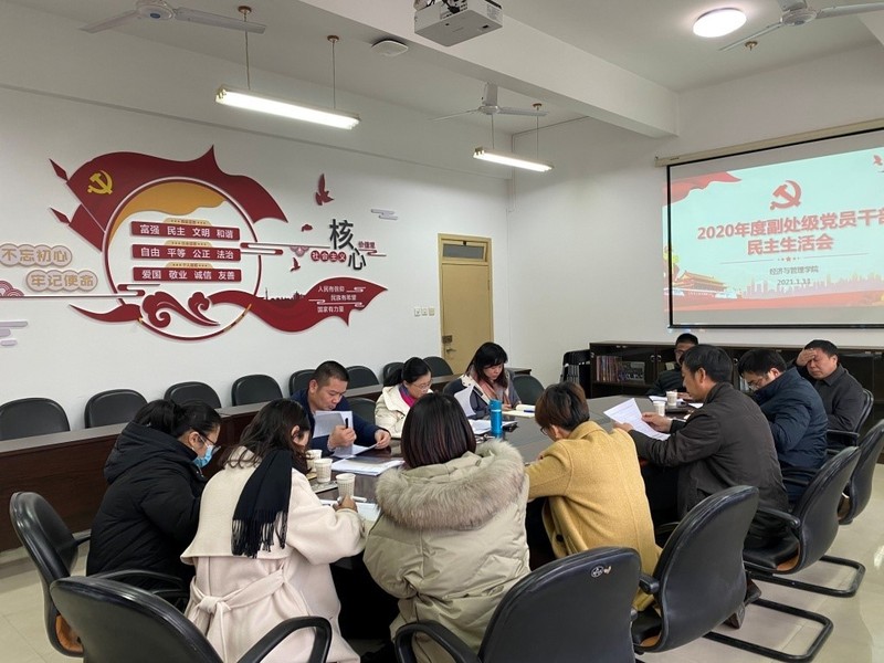 根據(jù)學(xué)院黨委的工作部署,2021年1月11日下午,經(jīng)濟與管理學(xué)院副處級領(lǐng)導(dǎo)干部民主生活會在31號樓412召開。學(xué)院民生活會督導(dǎo)組組長院黨委委員、副院長陳艷紅,督指導(dǎo)組聯(lián)系人院紀(jì)委副書記余土水,督導(dǎo)組成員院黨政辦副主任林品、院黨委組織部林倩茜到會指導(dǎo)。經(jīng)濟與管理學(xué)院黨總支書記俞素平、院長房曰榮、副書記林麗萍、副院長林穎、副院長吳吉明、副處級組織員黃瑞秋、分團委書記傅一丹及工作人員盧曉芬參加民主生活會。會議由經(jīng)管學(xué)院黨總支書記俞素平主持。