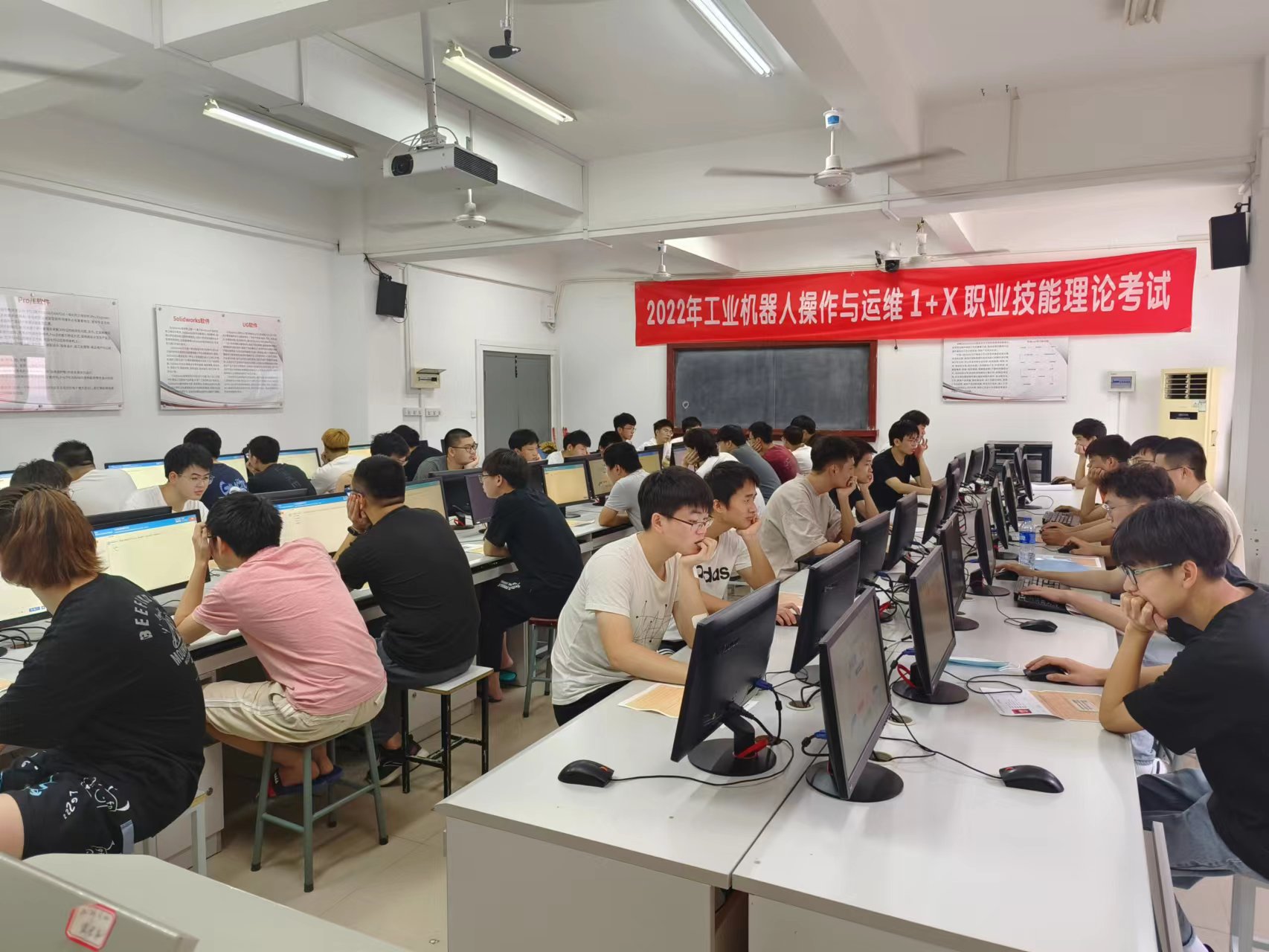 為貫徹落實(shí)《國家職業(yè)教育改革實(shí)施方案》和《關(guān)于在院校實(shí)施“學(xué)歷證書若干職業(yè)技能等級證書”制度試點(diǎn)方案》等文件精神。我校與2022年6月19日、26日分別進(jìn)行了工業(yè)機(jī)器人操作與運(yùn)維1+X證書試點(diǎn)理論考試、實(shí)操考試。本次考證對象為20級工業(yè)機(jī)器人技術(shù)專業(yè)學(xué)生共計(jì)80人,圓滿完成了本年度的考核。