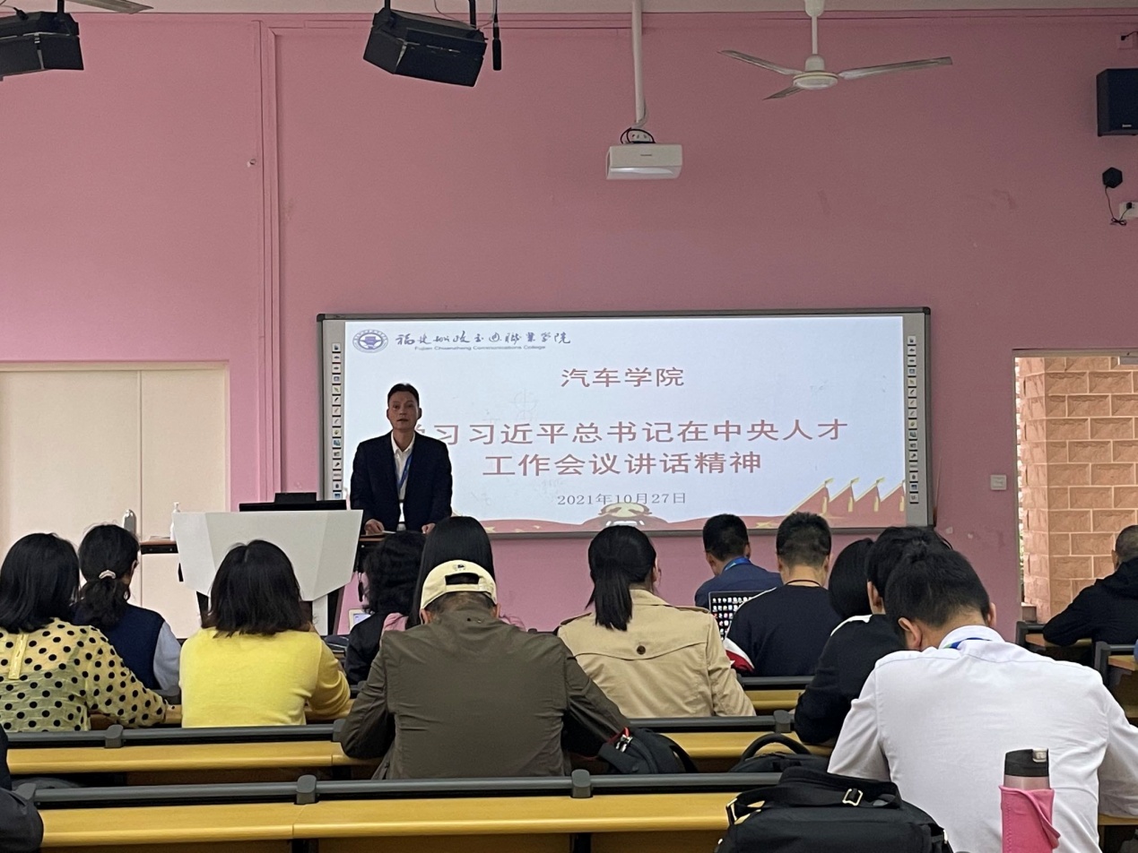10月27日下午,汽車學院黨總支召開全院教職工大會,學習貫徹習近平總書記在中央人才工作會議上重要講話精神,全體教職工參加會議,學院黨總支書記蔡華錦主持會議并講話。