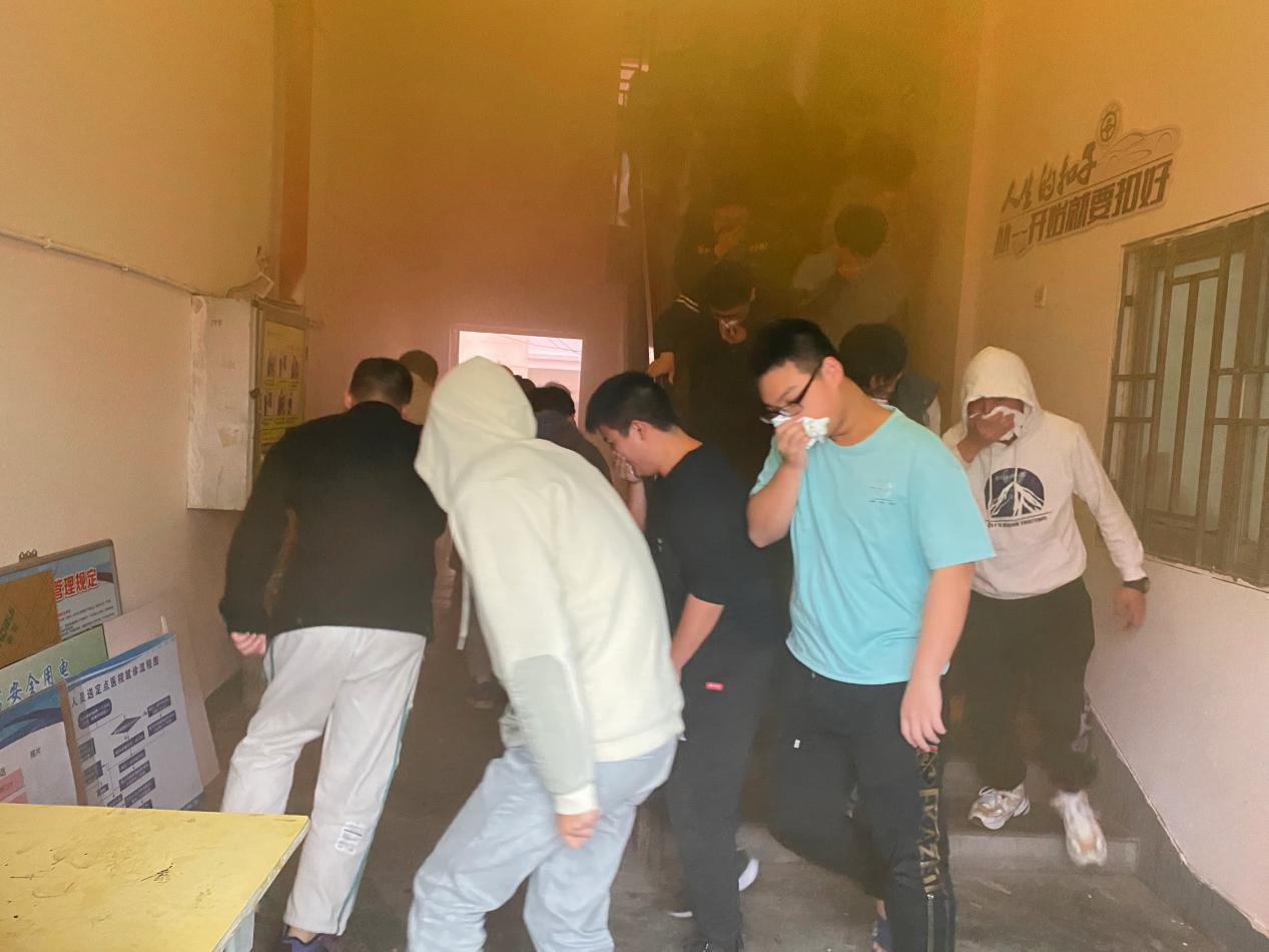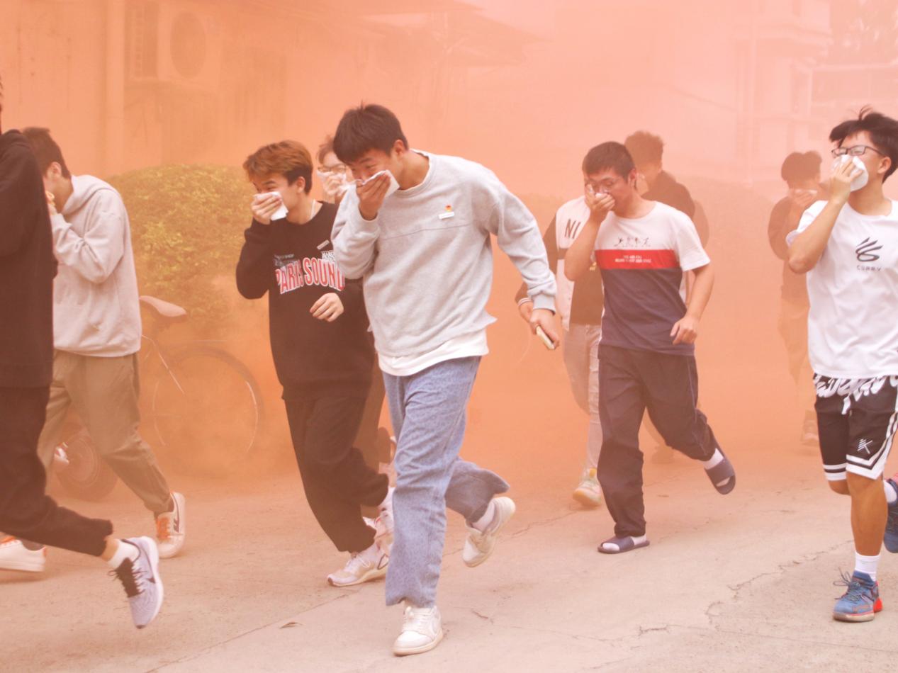 在北區(qū)24號汽車學院學生宿舍樓,一陣急促的火情報警鈴響起,汽車學院學生在志愿者的引導下,彎著腰,用濕手帕、濕毛巾等捂住口鼻,沿著疏散通道快速撤離到指定的安全區(qū)域,同學們迅速整隊并核查人數,整個應急演練活動有序、緊張、安全、高效,達到了預期效果。