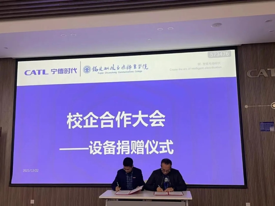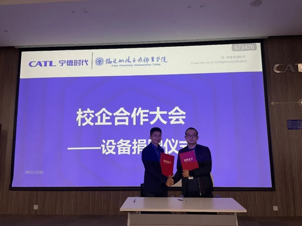 蘇慶列副院長代表我們學院與寧德時代代表曹彬經(jīng)理進行了寧德時代捐贈設(shè)備的簽約儀式,寧德時代將會捐贈一臺價值100萬元的模切機給我們學院。該設(shè)備投入教學后,將會完善我們學院的實訓室條件,使面向?qū)幍聲r代的訂單班學生可以提前學習并操作企業(yè)的生產(chǎn)設(shè)備,畢業(yè)后實現(xiàn)與企業(yè)無縫對接。