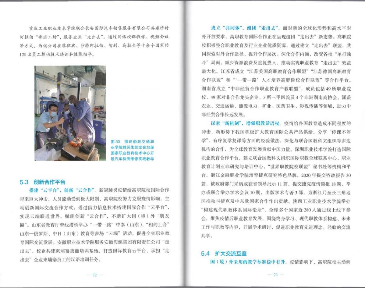 近日,由中國教育科學研究院、全國職業(yè)高等院校校長聯(lián)席會議編制的《2021中國職業(yè)教育質量年度報告》正式公布。我校朱劍寶老師在“一帶一路”國家加蓬國家職業(yè)技術教育中心開展汽車檢測維修實踐教學入選中國職業(yè)教育質量年報第25篇案例《多措并舉,服務國際產能合作》。