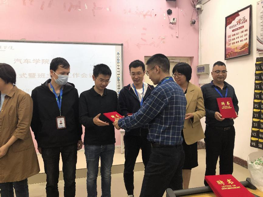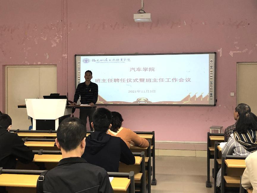 為貫徹落實《中共中央國務(wù)院關(guān)于加強和改進新形勢下高校思想政治工作的意見》、教育部《關(guān)于加強高等學(xué)校輔導(dǎo)員班主任隊伍建設(shè)的意見》等文件精神,加強班主任隊伍建設(shè),切實提高班主任的學(xué)生管理工作成效,2021年11月3日下午,汽車學(xué)院在2#1-3教室開展2021級班主任聘任儀式暨班主任工作會議。會議由汽車學(xué)院黨總支書記蔡華錦主持,汽車學(xué)院黨政領(lǐng)導(dǎo)班子成員、全體輔導(dǎo)員及各年級班主任參加了會議。