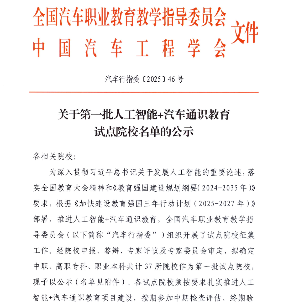 為深入貫徹落實習(xí)近平總書記關(guān)于發(fā)展人工智能的重要指示精神,落實全國教育大會精神和《教育強國建設(shè)規(guī)劃綱要(2024-2035年)》要求,根據(jù)《加快建設(shè)教育強國三年行動計劃(2025-2027年)》及教育部等九部門《關(guān)于加快推進教育數(shù)字化的意見》等文件精神,在人工智能技術(shù)全面賦能職業(yè)教育發(fā)展的新階段,我院積極推進人工智能技術(shù)深度賦能職業(yè)教育,近期成功獲批兩項全國汽車行指委第一批“‘AI+’汽車職業(yè)教育大模型應(yīng)用示范院校培育試點”和“人工智能+汽車通識教育試點院?!?。