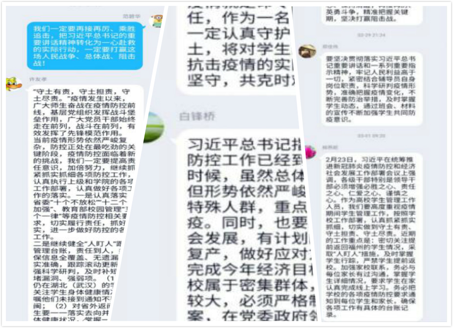 信息工程系黨總支書記許友孝同志說:“通過學(xué)習(xí),全體黨員進(jìn)一步堅(jiān)定把打贏疫情防控阻擊戰(zhàn)作為當(dāng)前的重大政治任務(wù),作為踐行初心使命、體現(xiàn)責(zé)任擔(dān)當(dāng)?shù)脑嚱鹗湍サ妒??!毙畔⒐こ滔档谝稽h支部全體黨員在黨日活動(dòng)中深入學(xué)習(xí)貫徹習(xí)近平總書記關(guān)于疫情防控工作的重要講話精神,教育部、省委省政府等上級(jí)關(guān)于疫情防控的重要精神和工作要求以及關(guān)于全面禁止非法野生動(dòng)物交易、革除濫食野生動(dòng)物陋習(xí)的決定。各位黨員圍繞學(xué)習(xí)主題進(jìn)行熱烈的討論,并在qq平臺(tái)發(fā)表了個(gè)人的學(xué)習(xí)感想。