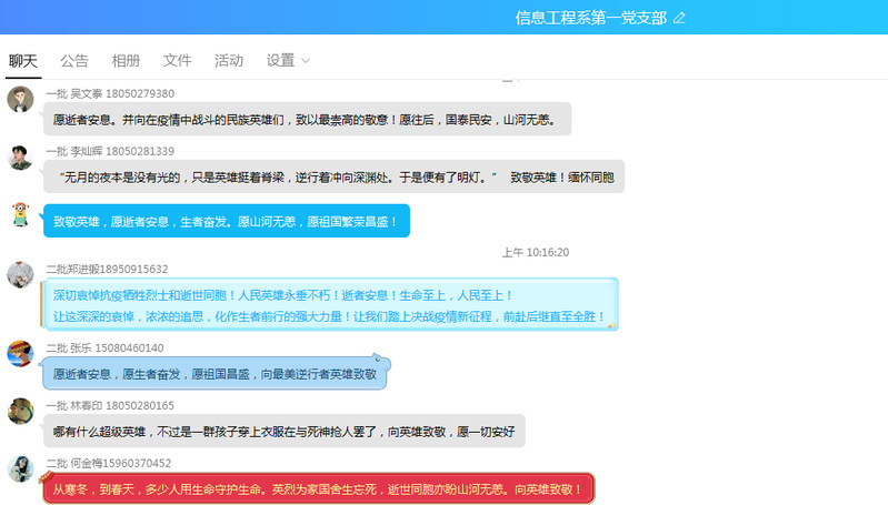 活動結(jié)束后,第一黨支部黨員們感觸頗深,紛紛在qq平臺上發(fā)表了自己的感想。信息工程系黨總支書記許友孝說:“銘記犧牲在抗疫一線的英雄,那些以命相搏、護(hù)山河手足無恙的,忠勇之魂;銘記不幸罹難的同胞,祖國不曾遺忘他們做出的犧牲!他們只是化作了星星,照亮我們前行的路!致敬英雄!” 系黨總支副書記柳燕妮表示,“銘記犧牲在抗疫一線的英雄,那些以命相搏、護(hù)山河手足無恙的,忠勇之魂;銘記不幸罹難的同胞,祖國不曾遺忘他們做出的犧牲!他們只是化作了星星,照亮我們前行的路!致敬英雄!”范碧華老師說:“致敬英雄,愿逝者安息,生者奮發(fā)。愿山河無恙,愿祖國繁榮昌盛!”