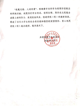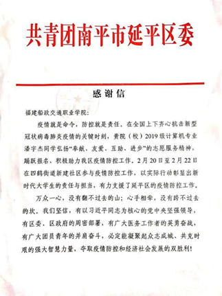 近期,信息工程系收到一封來自共青團(tuán)南平市延平區(qū)委的感謝信,來信主要是為了感謝我系19級(jí)軟件技術(shù)專業(yè)學(xué)生潘宇杰同學(xué)。疫情期間,潘宇杰同學(xué)積極報(bào)名參加社區(qū)防疫工作,有力支援了南平市延平區(qū)的疫情防控工作。信中共青團(tuán)延平區(qū)委高度表揚(yáng)了潘宇杰同學(xué)志愿參與疫情防控的無私奉獻(xiàn)精神,同時(shí)也表達(dá)了祝我院越辦越好,桃李滿天下的美好祝愿。