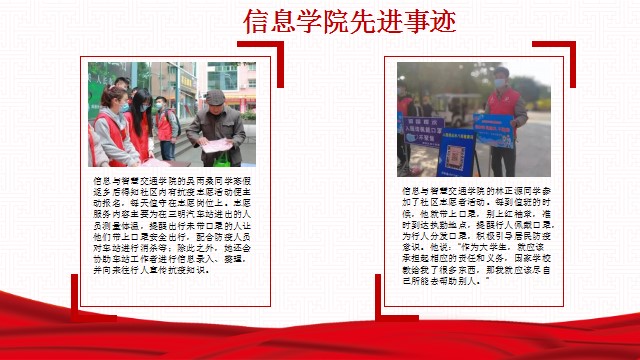 本次“開學(xué)第一課”還宣傳并表彰了我院學(xué)子在寒假期間積極參加抗疫志愿者的先進(jìn)事跡。寒假期間,我院積極組織動員青年學(xué)生們在家鄉(xiāng)所在地就近就便開展個人寒假社會實踐活動,引導(dǎo)青年學(xué)生深入基層一線,在服務(wù)國家、服務(wù)社會中受教育、長本領(lǐng)、做貢獻(xiàn)。會上對他們的貢獻(xiàn)表示肯定,同時號召全院同學(xué)以他們?yōu)榘駱?,向他們學(xué)習(xí)。