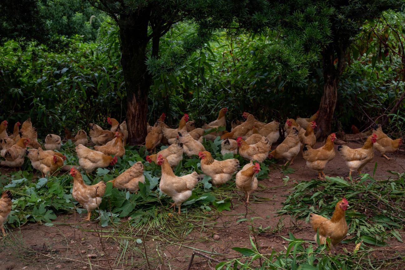 據(jù)介紹,這里曾經(jīng)是寸草不生、水土流失嚴(yán)重的稀土礦廢棄場(chǎng)。2006年,雞場(chǎng)創(chuàng)辦人藍(lán)曉紅承包村里的500畝荒山,開始了“種樹+養(yǎng)雞”的綠色生態(tài)雞場(chǎng)建設(shè)事業(yè)。此后的日子在“種樹—養(yǎng)雞—賣雞苗—種樹”中循環(huán)往復(fù),藍(lán)曉紅在銷售雞苗過程中,每到一地都要帶回不少樹苗。多年來,她種下桂花、油茶、毛竹、紅豆杉等苗木1萬余株,終于將這里變成了綠樹成蔭、雞鳥爭鳴的美麗綠洲。水土生態(tài)的改善也為河田雞的養(yǎng)殖提供了天然場(chǎng)所。雞奔走綠林山間,食百草飛蟲,飲山泉溪水,成為了營養(yǎng)豐富、口感緊實(shí)的世界名雞。而雞的雞糞又為林子提供了養(yǎng)料,儼然形成了一種共生共存的可持續(xù)發(fā)展模式。