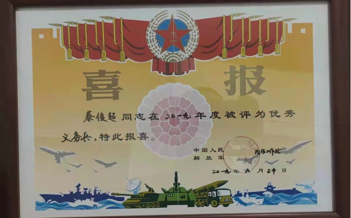 在第一次入伍期間,他對自己嚴格要求,憑借著自己強大的毅力和好強的性格,刻苦訓練,很快在隊伍中脫穎而出,榮獲“優(yōu)秀義務(wù)兵”稱號。