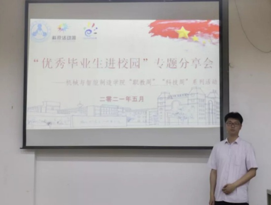 同日,為進(jìn)一步加強(qiáng)學(xué)風(fēng)建設(shè),調(diào)動(dòng)學(xué)生學(xué)習(xí)熱情,明確奮斗方向,我院于北區(qū)26號(hào)樓605室舉辦 “職教周”“科技周”系列活動(dòng)之“優(yōu)秀畢業(yè)生進(jìn)校園主題分享會(huì)”,邀請(qǐng)2011級(jí)機(jī)電一體化專業(yè)畢業(yè)生丁智文與在校學(xué)生做分享報(bào)告。丁智文從自身求學(xué)與工作經(jīng)歷出發(fā),與同學(xué)們交流了關(guān)于學(xué)習(xí)和工作的成長(zhǎng)心得,會(huì)上氣氛熱烈,同學(xué)們表示,此次分享會(huì)在一定程度上幫助他們找到三年大學(xué)生活的方向,引發(fā)了對(duì)人生和未來(lái)的深度思考,受益良多。