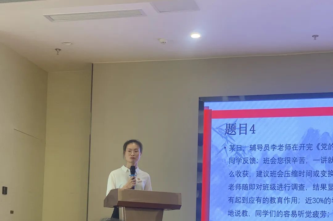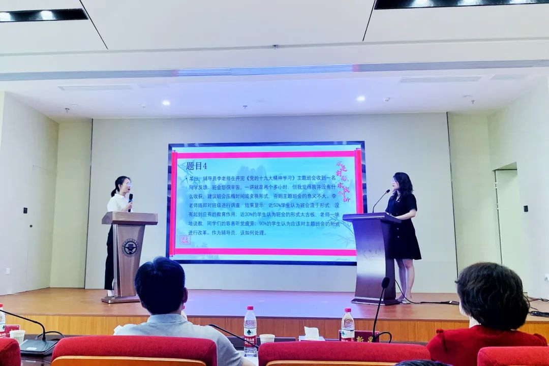 比賽過程中,各位參賽選手準備充分、沉穩(wěn)應對,用出色的表現(xiàn)高度還原了開展大學生思想政治工作的日常情景,共同研討了如何更好地圍繞學生、關(guān)照學生、服務學生的工作思路。其中,我院輔導員張舒姨憑借扎實的理論功底、過硬的專業(yè)素養(yǎng)、出色的賽場表現(xiàn),榮獲三等獎。