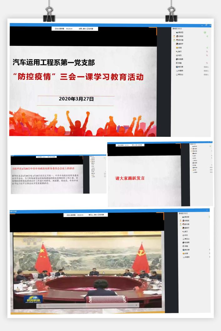 2020年3月27日,根據(jù)學(xué)院黨委工作部的通知要求,汽車運(yùn)用工程系第一黨支部三月份的三會(huì)一課和主題黨日活動(dòng),首次采取線上支部學(xué)習(xí)的形式開展。第一黨支部書記黃佳瑩采用QQ同屏播放的形式,組織全體黨員老師學(xué)習(xí)觀看中央在防抗疫情工作中的部署講話視頻以及《黨委(黨組)落實(shí)全面從嚴(yán)治黨主體責(zé)任規(guī)定》內(nèi)容,進(jìn)一步深入學(xué)習(xí)領(lǐng)會(huì)習(xí)近平總書記在中共中央政治局常務(wù)委員會(huì)上關(guān)于疫情防控工作的重要講話精神。
