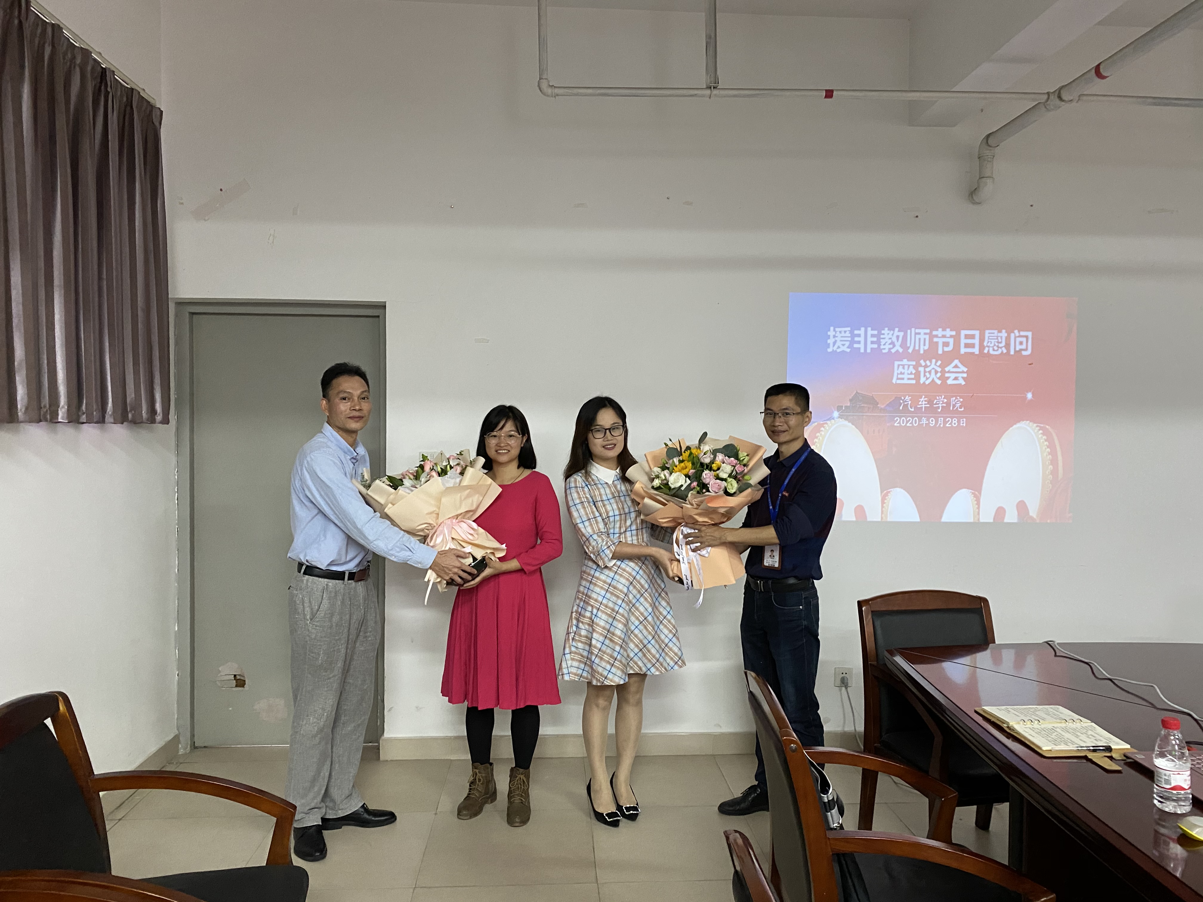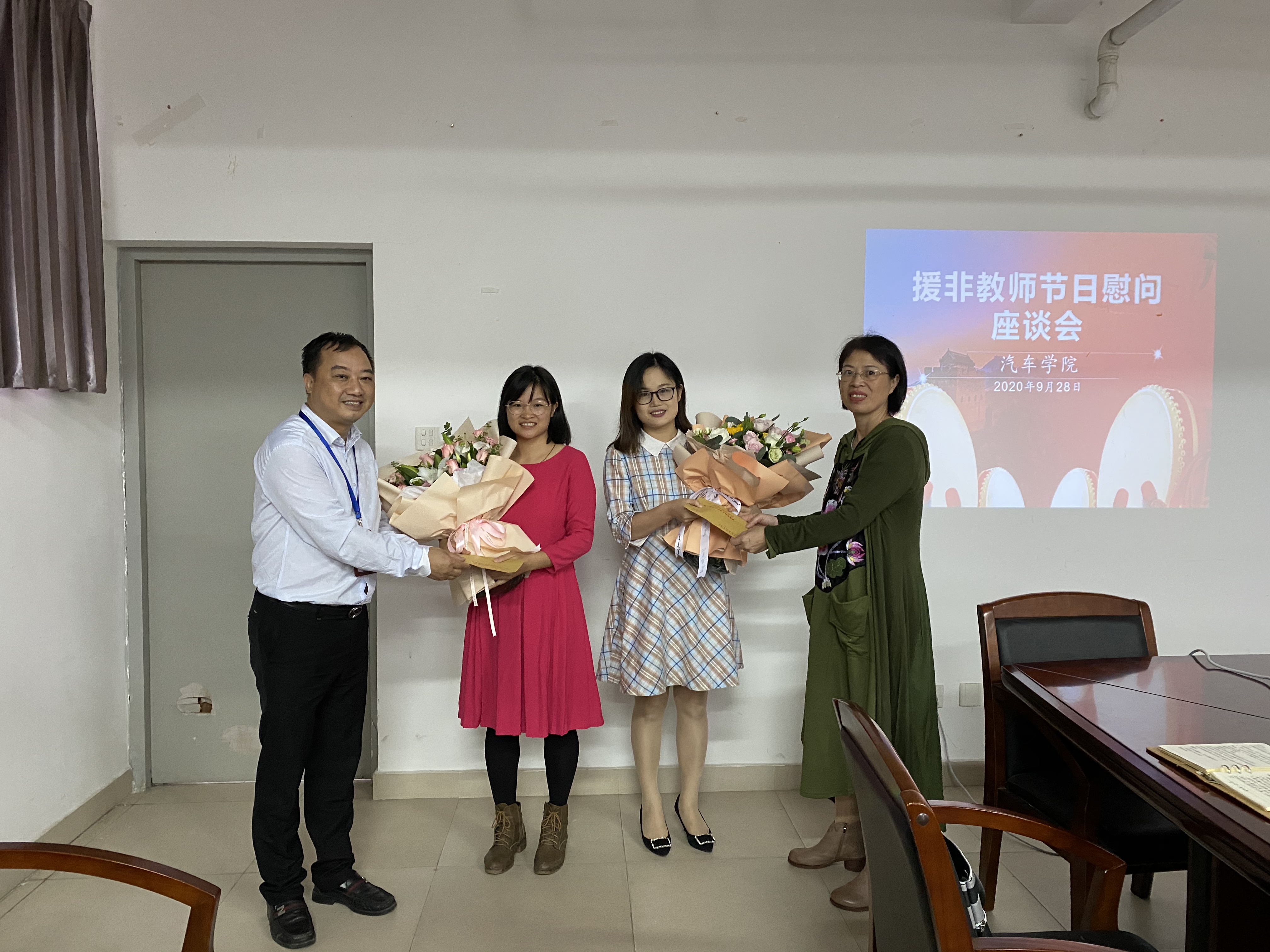 2020年9月28日,學(xué)校工會(huì)、教師工作部、對(duì)外交流中心和汽車(chē)學(xué)院等部門(mén)聯(lián)合對(duì)我校四位援非教師進(jìn)行節(jié)日慰問(wèn),在汽車(chē)學(xué)院會(huì)議室召開(kāi)了“援非教師節(jié)日慰問(wèn)座談會(huì)”。參加座談會(huì)的有各部門(mén)代表及援非教師家屬代表,參會(huì)代表非常關(guān)心朱劍寶、葉陳勇、杜盼成、吳庚等在非洲工作的老師家屬的工作、生活、孩子上學(xué)等方面的情況,大家都表示:學(xué)校是援非教師們的堅(jiān)強(qiáng)后盾,相關(guān)部門(mén)會(huì)做好各項(xiàng)服務(wù)工作,解決教師們實(shí)際困難,為他們解決后顧之憂(yōu),讓他們能夠安心的在外工作。對(duì)家屬們的理解和支持表示衷心的感謝!