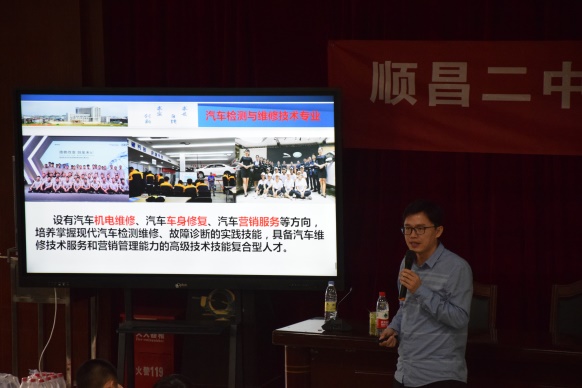活動(dòng)分為主題講座和技能實(shí)操兩個(gè)部分。在順昌二中,林可春副院長解讀了目前國家的職業(yè)教育政策,梁霖鋒老師介紹了汽車學(xué)院的專業(yè)設(shè)置、職業(yè)崗位發(fā)展,企業(yè)專家陳育彬作為優(yōu)秀畢業(yè)生代表分享了自己求學(xué)及成長為省級(jí)技能大師的經(jīng)歷,而陳小紅作為順昌籍的優(yōu)秀畢業(yè)生,分享了從學(xué)校畢業(yè)到成功創(chuàng)業(yè)的故事。同學(xué)們聽后紛紛表示,這讓他們了解了職業(yè)教育,也對他們職業(yè)發(fā)展方向的規(guī)劃以及職業(yè)態(tài)度的培養(yǎng)有很大的促進(jìn)作用。
