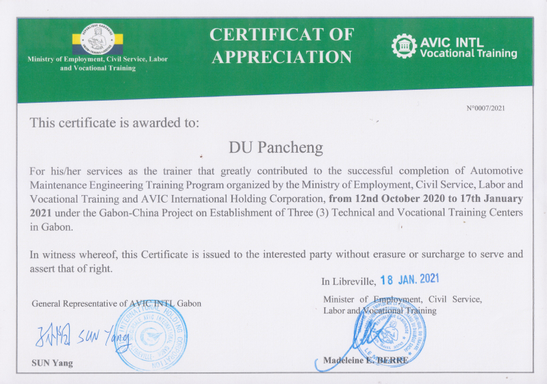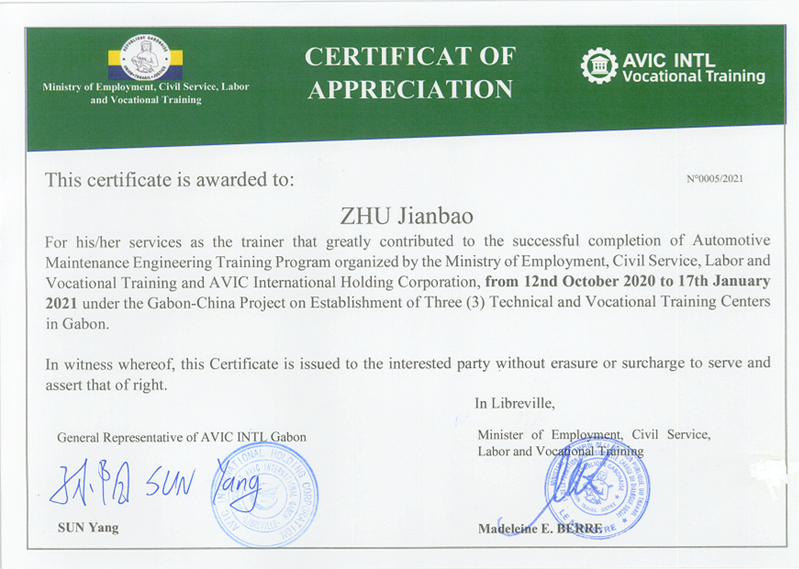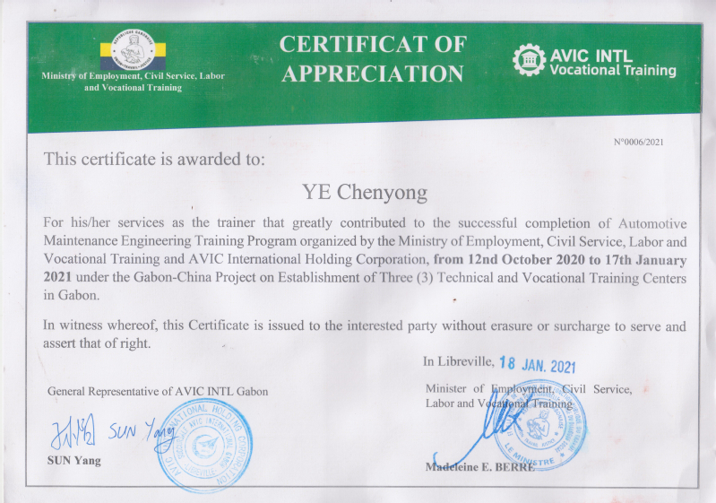 在中航國(guó)際、3位教師和譯員們的大力合作和支持下,培訓(xùn)組通過管理創(chuàng)新克服了培訓(xùn)初期的各種困難,最終在防疫零感染的前提下,順利完成了為期14周的汽修專業(yè)師資培訓(xùn)。學(xué)員考試平均分?jǐn)?shù)87.89,高于講師制定的85分標(biāo)準(zhǔn)線。加蓬國(guó)家、學(xué)員和中航國(guó)際對(duì)三位教師的培訓(xùn)水平給予很高的評(píng)價(jià)。加蓬勞工部專門分別對(duì)三位教師頒發(fā)了嘉獎(jiǎng)狀。