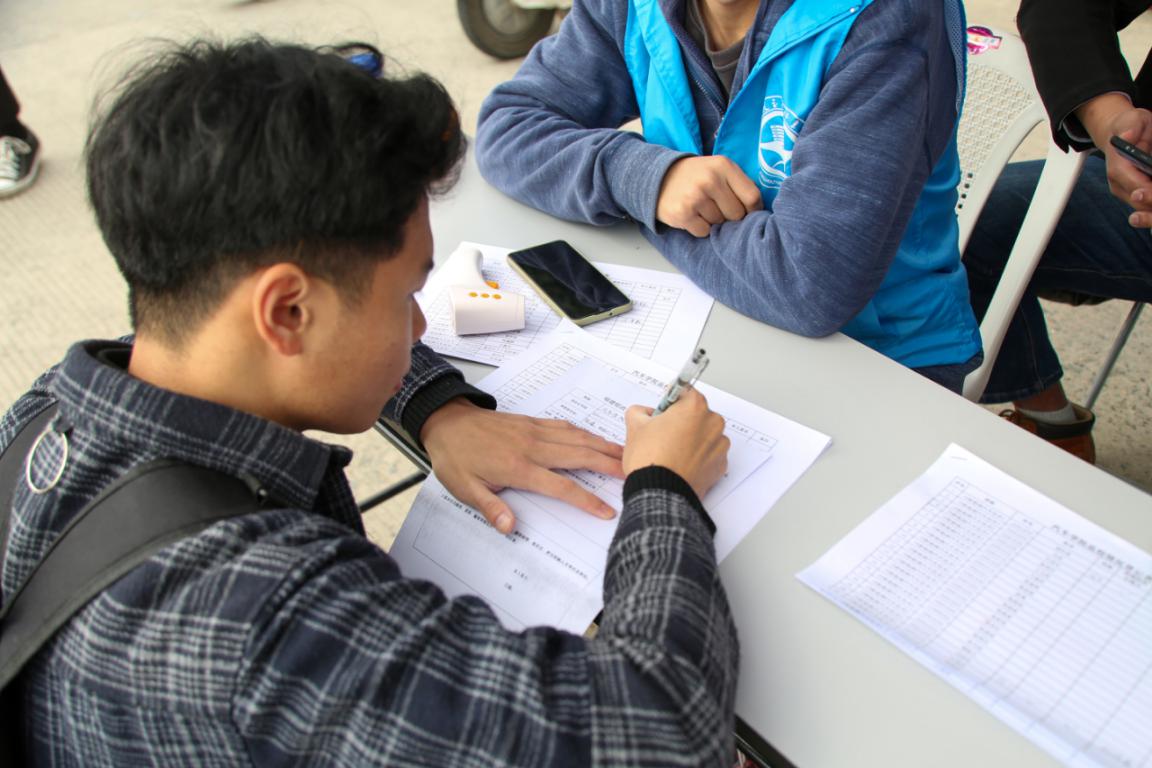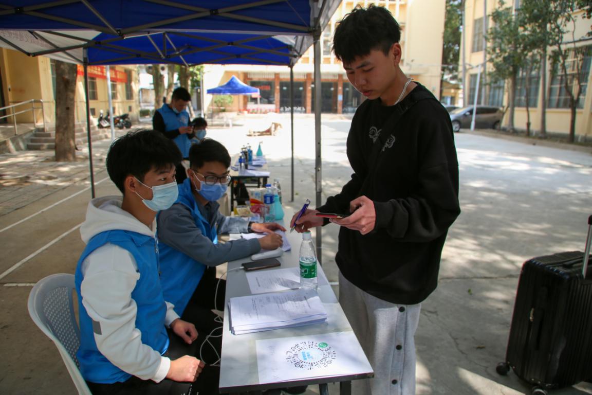 報道點志愿者對返校學生進行登記,并進行體溫監(jiān)測登記以及收集同學們上交的《健康承諾書》。