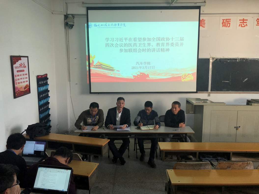 2021年3月17日,汽車學(xué)院組織全體教職工學(xué)習(xí)“習(xí)近平在看望參加全國(guó)政協(xié)十三屆四次會(huì)議的醫(yī)藥衛(wèi)生界、教育界委員并參加聯(lián)組會(huì)時(shí)的講話精神”。
