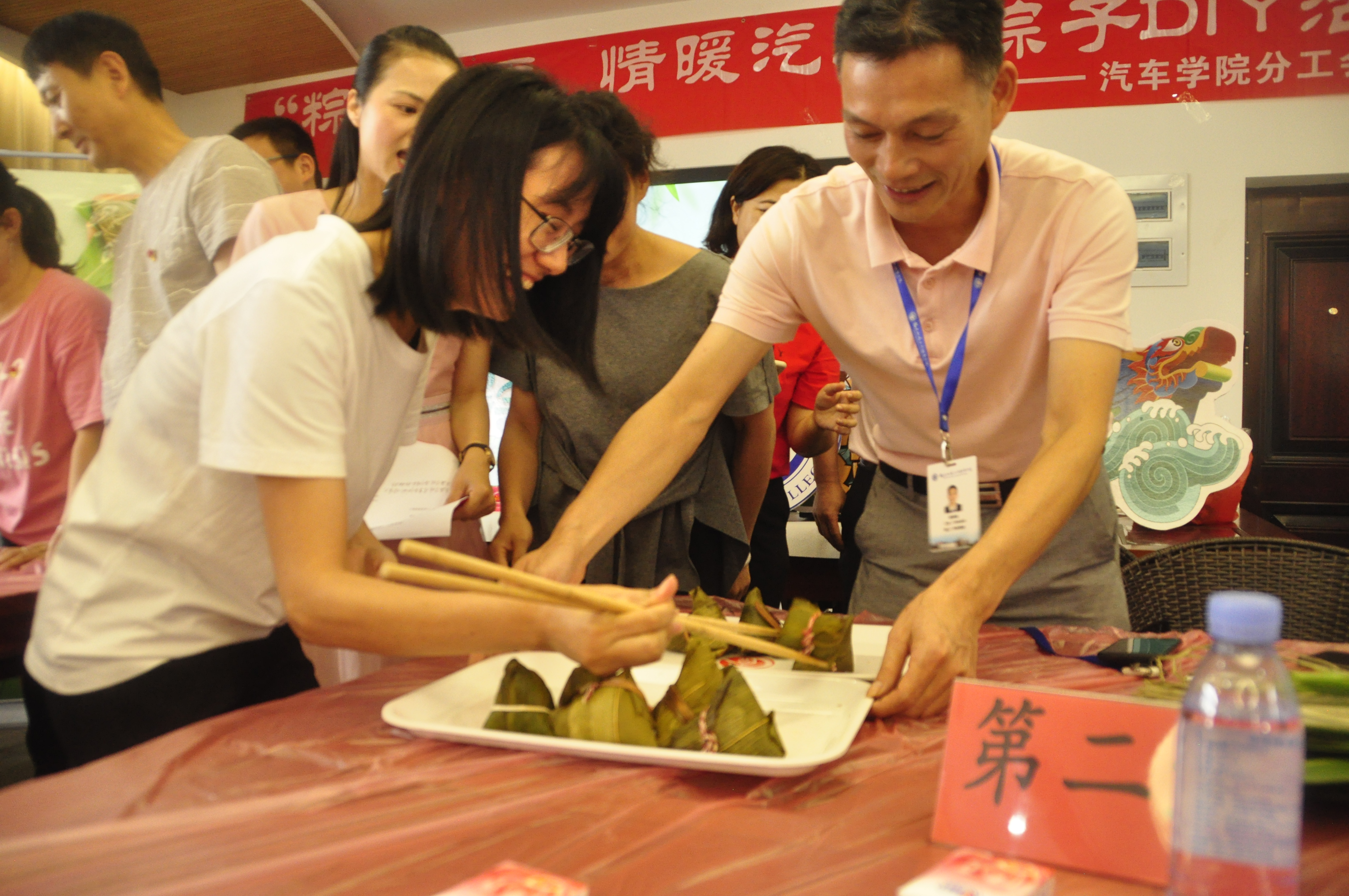 “粽葉飄香,情暖汽車”迎端午活動正在拉開序幕:首先進行了兩個熱身小游戲,大風吹和長筷子夾粽子,氣氛熱鬧非凡;接著由汽車學院特邀包粽子能手現(xiàn)場演示教授如何包粽子,老師們都認真的學習、反復的試驗。在主持人宣布比賽開始后,大家你追我趕包起粽子,場面一時十分火爆。比賽結束后,評委們?yōu)檫x手包的粽子進行了點評,評選出一、二、三等獎。最后大家一起品嘗自己親手包的熱騰騰香噴噴的粽子。