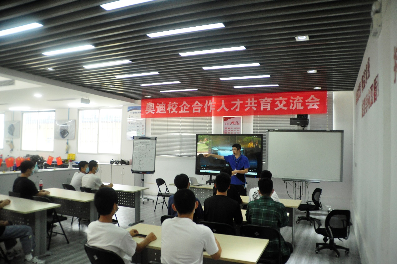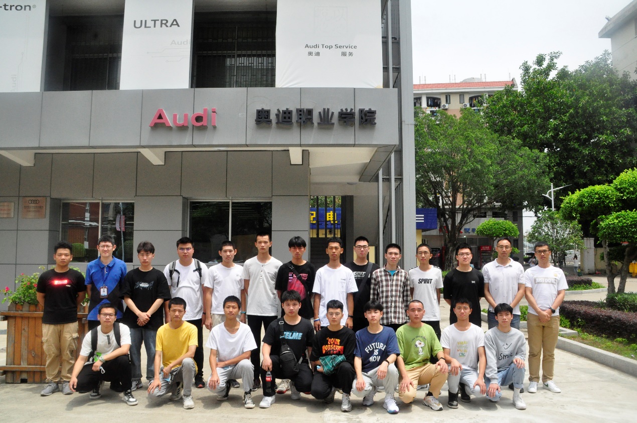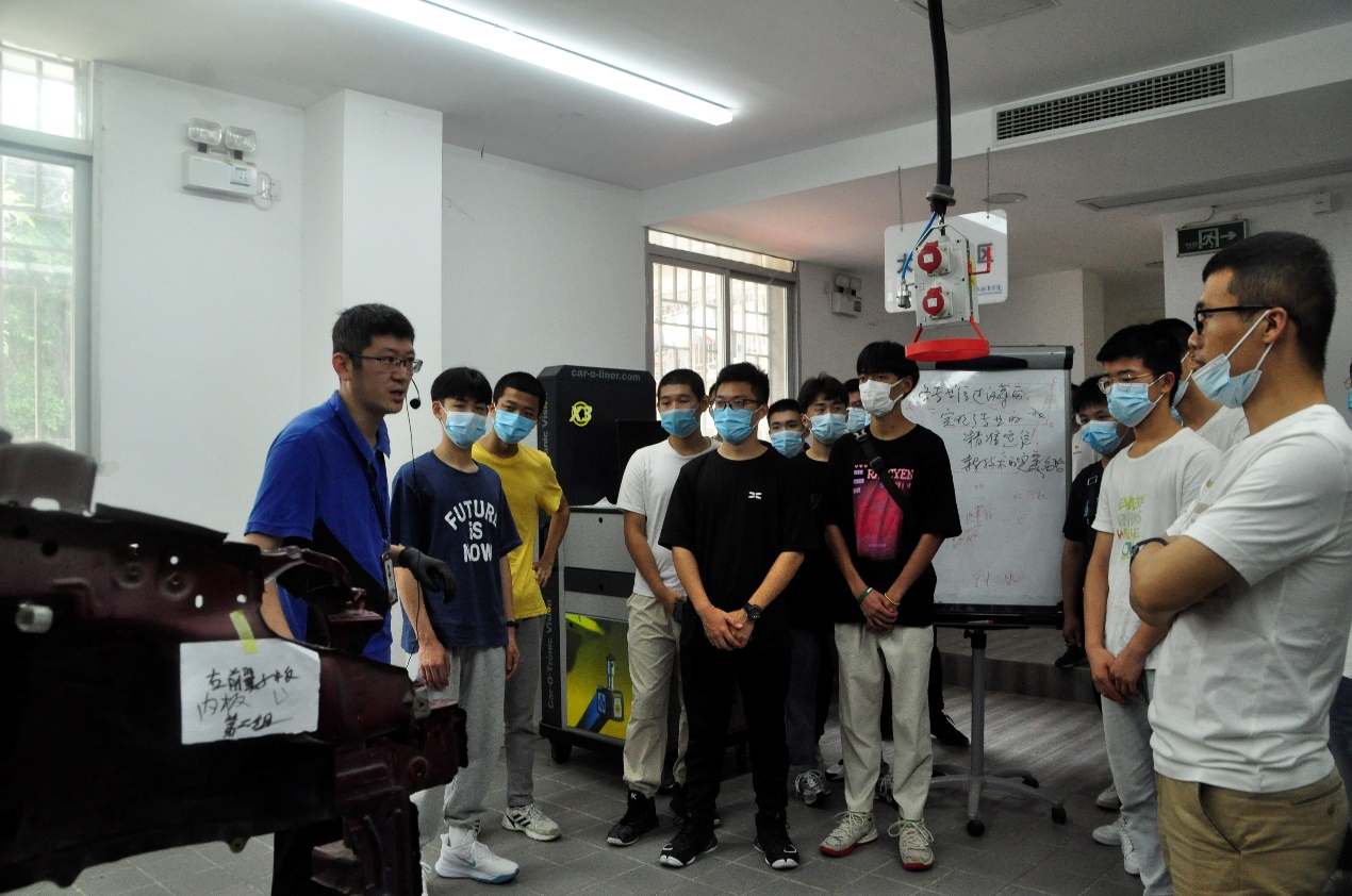 上午9點半,由福建理工學(xué)校魏日成老師和伍英賢老師帶領(lǐng)的20名中職學(xué)生,乘坐大巴來到南區(qū)的奧迪實訓(xùn)中心。汽車學(xué)院的黃知秋老師帶領(lǐng)理工學(xué)校的老師和同學(xué)們參觀了一樓的奧迪機電實訓(xùn)室和二樓的鈑金實訓(xùn)室。