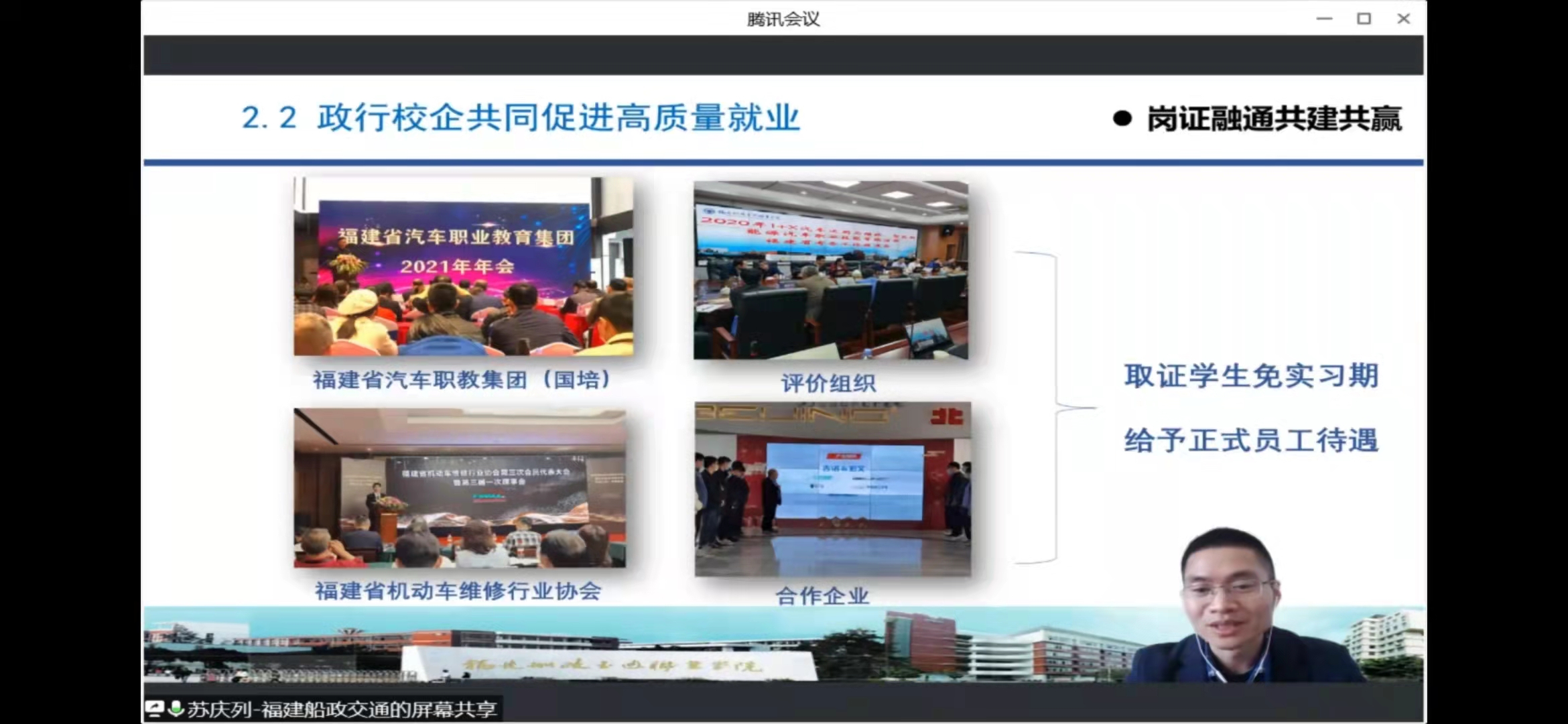 汽車學(xué)院蘇慶列院長(zhǎng)受邀在會(huì)上作“崗證融通基地建設(shè)設(shè)想”的報(bào)告,分享了汽車學(xué)院對(duì)接1+X職業(yè)證書(shū)制度,將崗證融通融入教學(xué),研修人才培養(yǎng)方案、重構(gòu)課程教學(xué)標(biāo)準(zhǔn)、實(shí)施模塊化教學(xué)等教學(xué)改革,從校企合作共建崗證融通實(shí)訓(xùn)基地、政行校企共同促進(jìn)高質(zhì)量就業(yè)、崗證融通基地助力1+X證書(shū)推廣三個(gè)維度提出了崗證融通共建共贏的設(shè)想,報(bào)告獲得與會(huì)代表的熱烈好評(píng)。