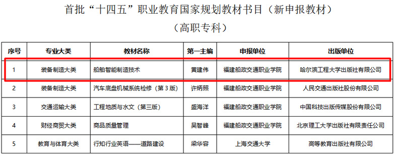 6月30日,教育部公布了首批“十四五”職業(yè)教育國家規(guī)劃教材書目,根據(jù)《“十四五”職業(yè)教育規(guī)劃教材建設(shè)實施方案》和《教育部辦公廳關(guān)于組織開展“十四五”首批職業(yè)教育國家規(guī)劃教材遴選工作的通知》要求,經(jīng)有關(guān)單位申報、形式審查、專家評審、專項審核、專家復(fù)核、面向社會公示等程序,共確定7251種教材入選首批“十四五”職業(yè)教育國家規(guī)劃教材(以下簡稱“十四五”國規(guī)教材),涵蓋全部19個專業(yè)大類、1382個專業(yè)。航海技術(shù)專業(yè)群入選三本,其中新申報入選1本,“十三五”復(fù)核教材入選兩本。
