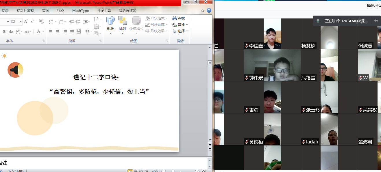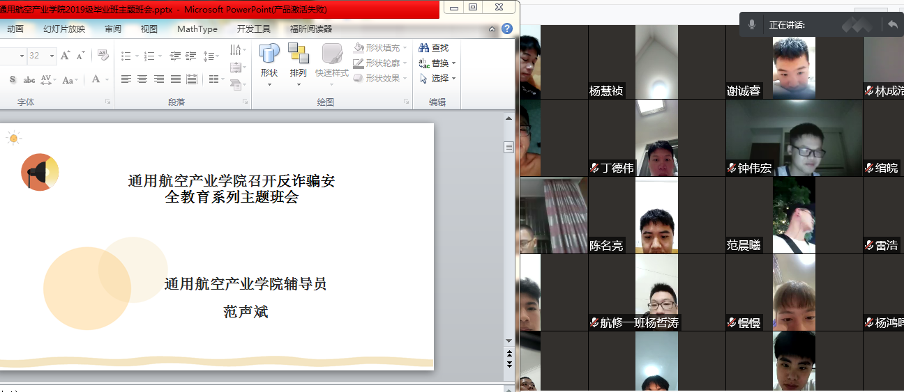 隨著社會的發(fā)展,信息技術的進步,各種詐騙現(xiàn)象也成為社會日益突出的問題,為了讓同學們發(fā)現(xiàn)問題并及時解決,提高校園防范詐騙意識,降低校園詐騙的風險,增強學生自我保護意識和避險能力,保障學生安全。通用航空產(chǎn)業(yè)學院通過線上+線下召開防詐騙安全教育暨開學第一課主題班會,主題班會由輔導員范聲斌老師、輔導員陸李欽及各班主任主持。