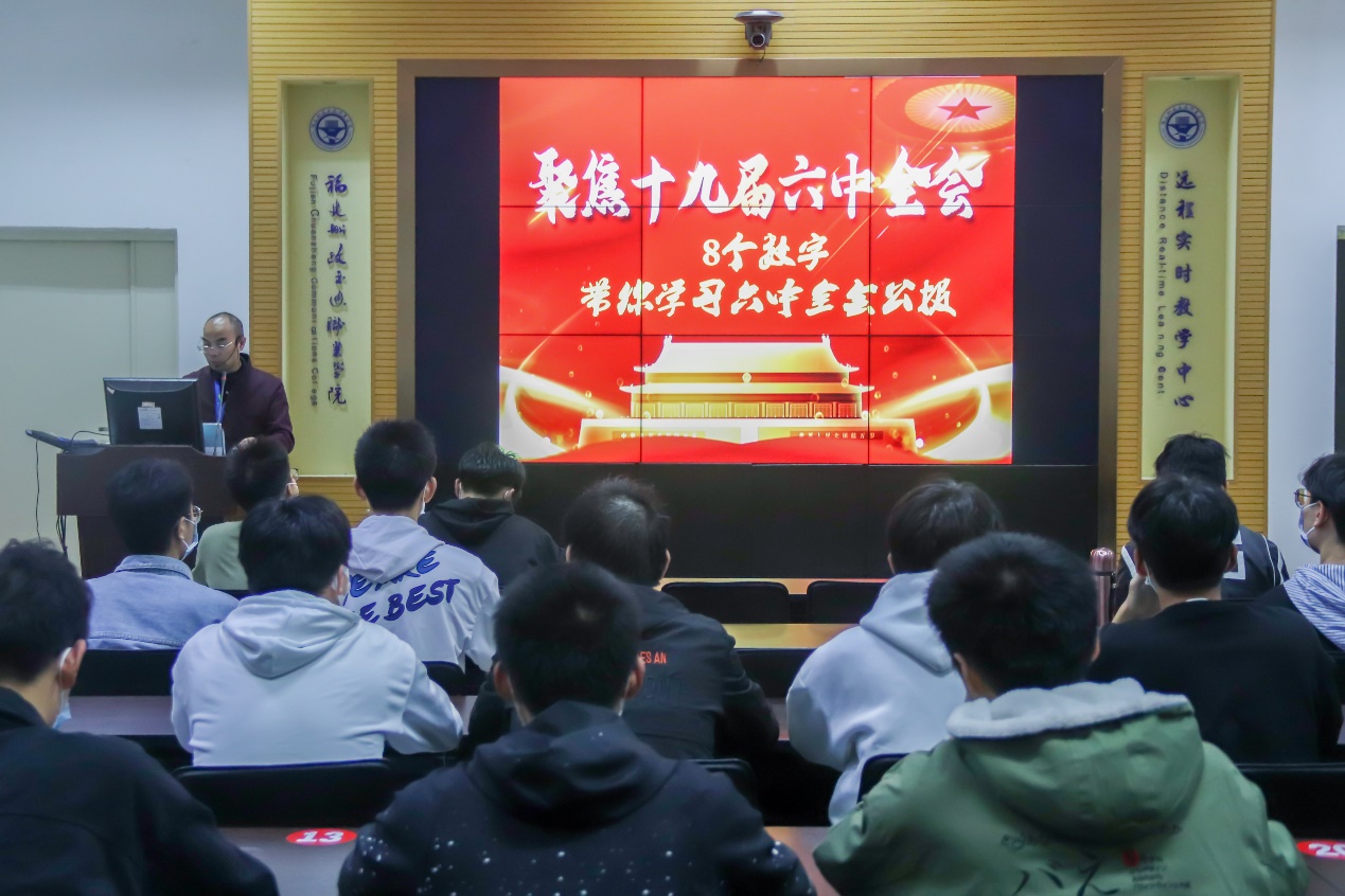 信息與智慧交通學(xué)院黨總支書記許友孝分別圍繞六中全會(huì)中2個(gè)“確立”、3個(gè)“需要”、4個(gè)“時(shí)期”、4個(gè)“任務(wù)”、5大歷史意義……八個(gè)數(shù)字帶我們學(xué)習(xí)十九屆六中全會(huì)。